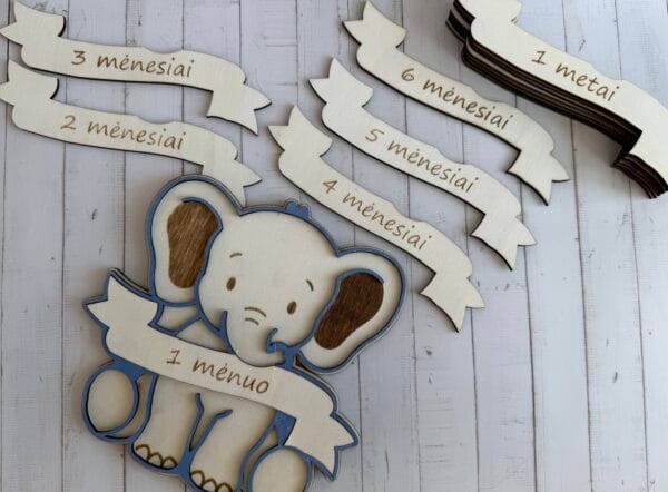 Mūsų medinis „Drambliukas“ – tai ne tik dekoracija, tai jūsų kūdikio augimo istorijos dalis. Kaip tai veikia? Tiesiog pakeiskite medinę lentelę ant drambliuko pilvuko ir nufotografuokite mažylį. Nuo „1 mėnesio“ iki „1 metų“ – stebėkite, kaip jis auga šalia savo mielo draugo!