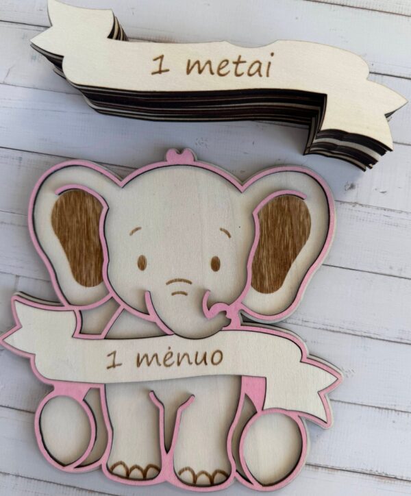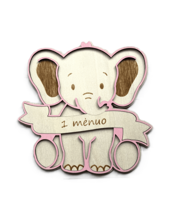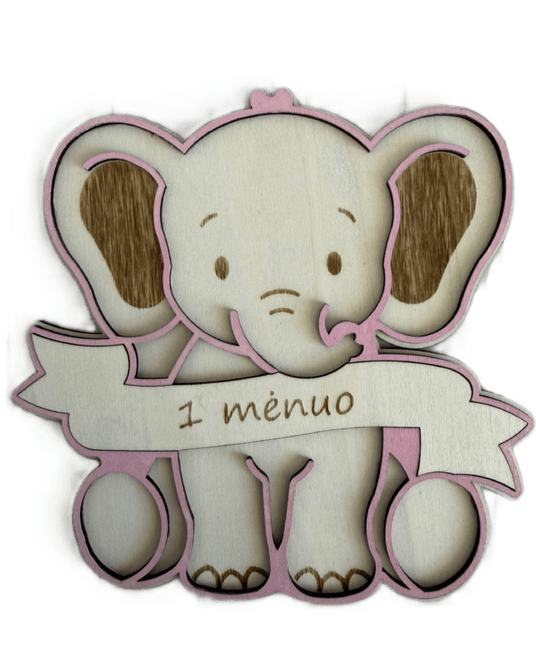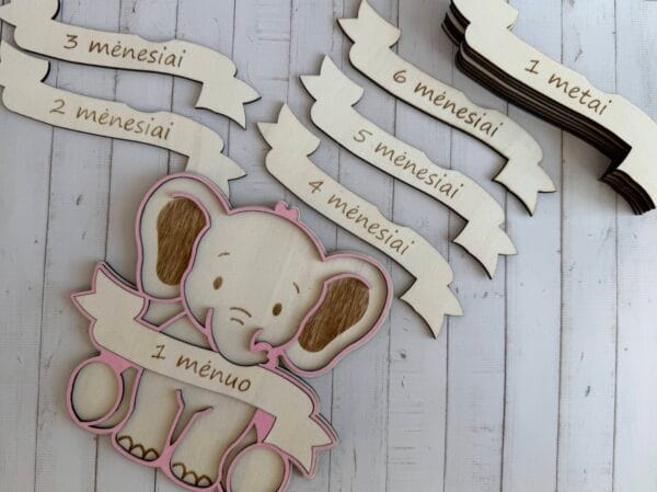 Mūsų medinis „Drambliukas“ – tai ne tik dekoracija, tai jūsų kūdikio augimo istorijos dalis. Kaip tai veikia? Tiesiog pakeiskite medinę lentelę ant drambliuko pilvuko ir nufotografuokite mažylį. Nuo „1 mėnesio“ iki „1 metų“ – stebėkite, kaip jis auga šalia savo mielo draugo!